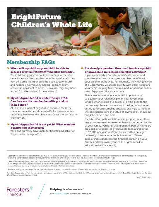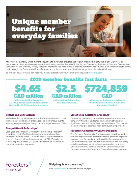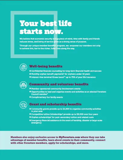 From your family to your future, Foresters has you covered. Foresters offers a wide range of unique and complimentary benefits!